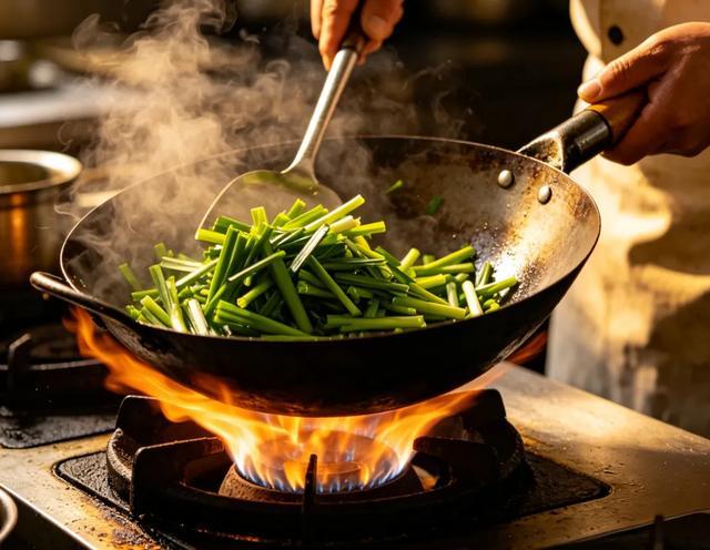 全程火候要大、速度要快,千万不要炒太久,否则韭菜会软烂出水,失去爽脆口感,香味也会大打折扣。